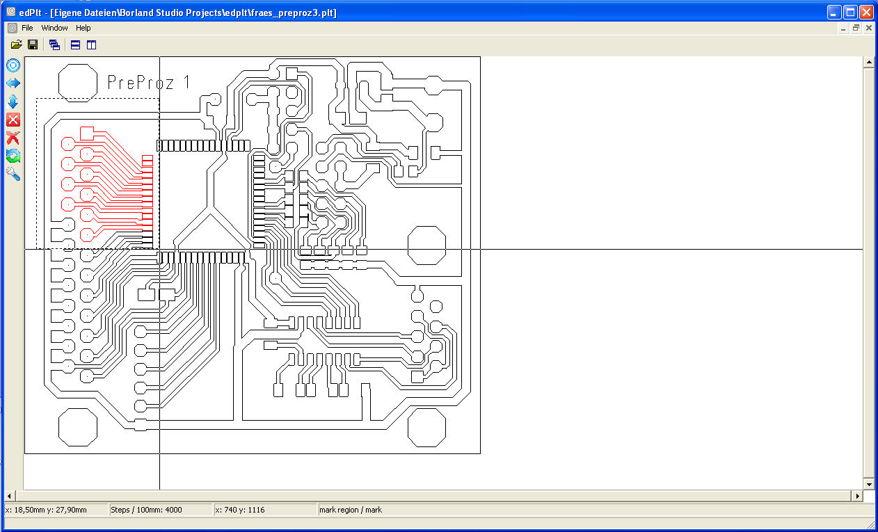 Die Ausgabe der Maße (Statuszteile) beziehen sich auf eine Skallierung von 40 Schritten pro Millimeter. Wir eine Skalierung angegeben, wird dies basierend auf eine Ausgabe von 40 Schritten pro Millimeter umgerechnet. Hat man einen Fräser oder Plotter, der nicht 40 Schritte pro Millimeter hat, ist es nicht sinnvoll eine Skalierung vorzunehmen! In diesem Fall muß die richtige Skallierung durch das Programm erfolgen das die Plottdatei erstellt.